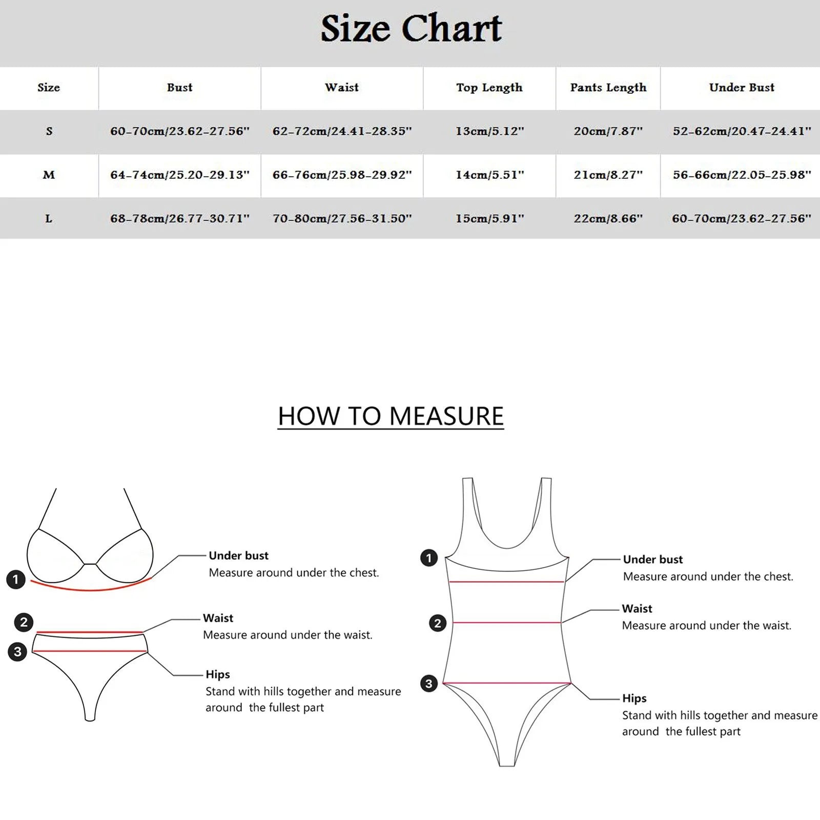 | Size:M | Bust:64-74cm/25.20-29.13'' | Waist:66-76cm/25.98-29.92'' | Top Length:14cm/5.51'' | Pants Length:21cm/8.27'' | Under Bust:56-66cm/22.05-25.98'' |