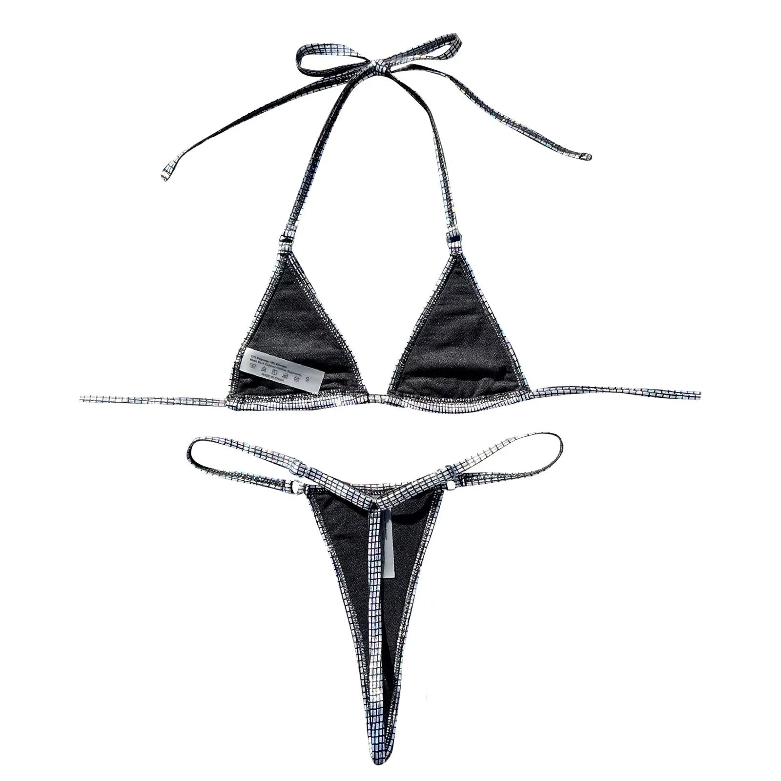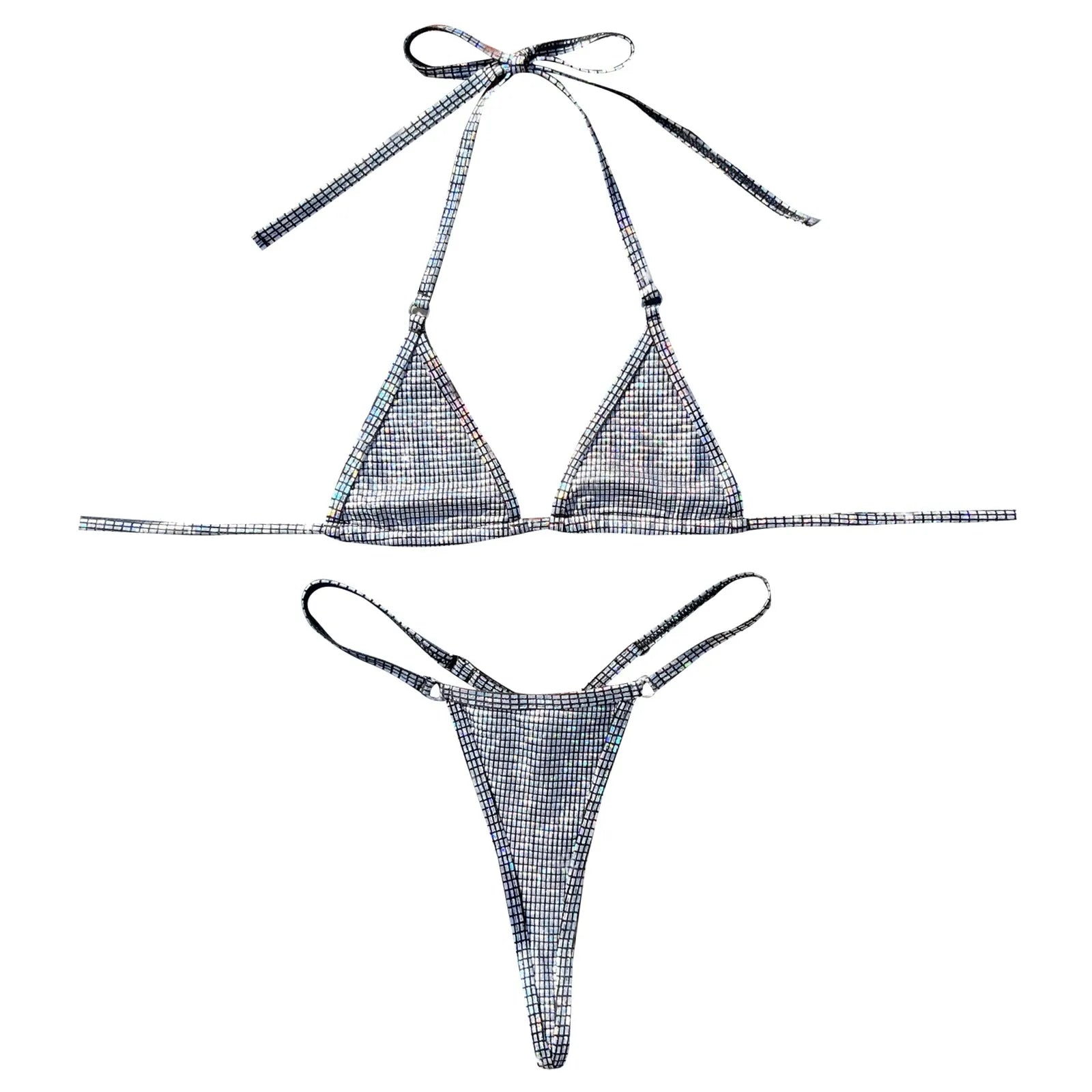 Glitter Silver Triangle Brazilian Bikini Push Up Swimwear Women Sexy Bathing Suits Thongs Halter Neck Lace Up Micro Swimsuits